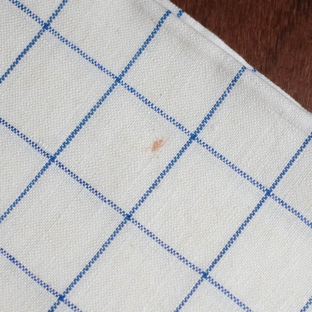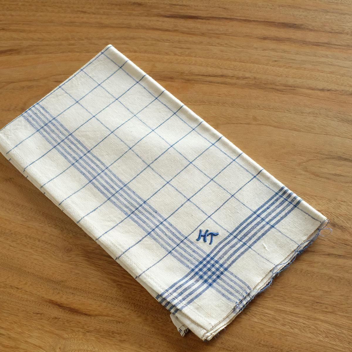 青いチェック柄のDDR時代のキッチンクロス。スッキリと清潔感がありますね。青い糸でHTとモノグラムの刺しゅう入り。ループがついているので、濡れた時乾かすのにも便利です。素材は綿麻と思われます。