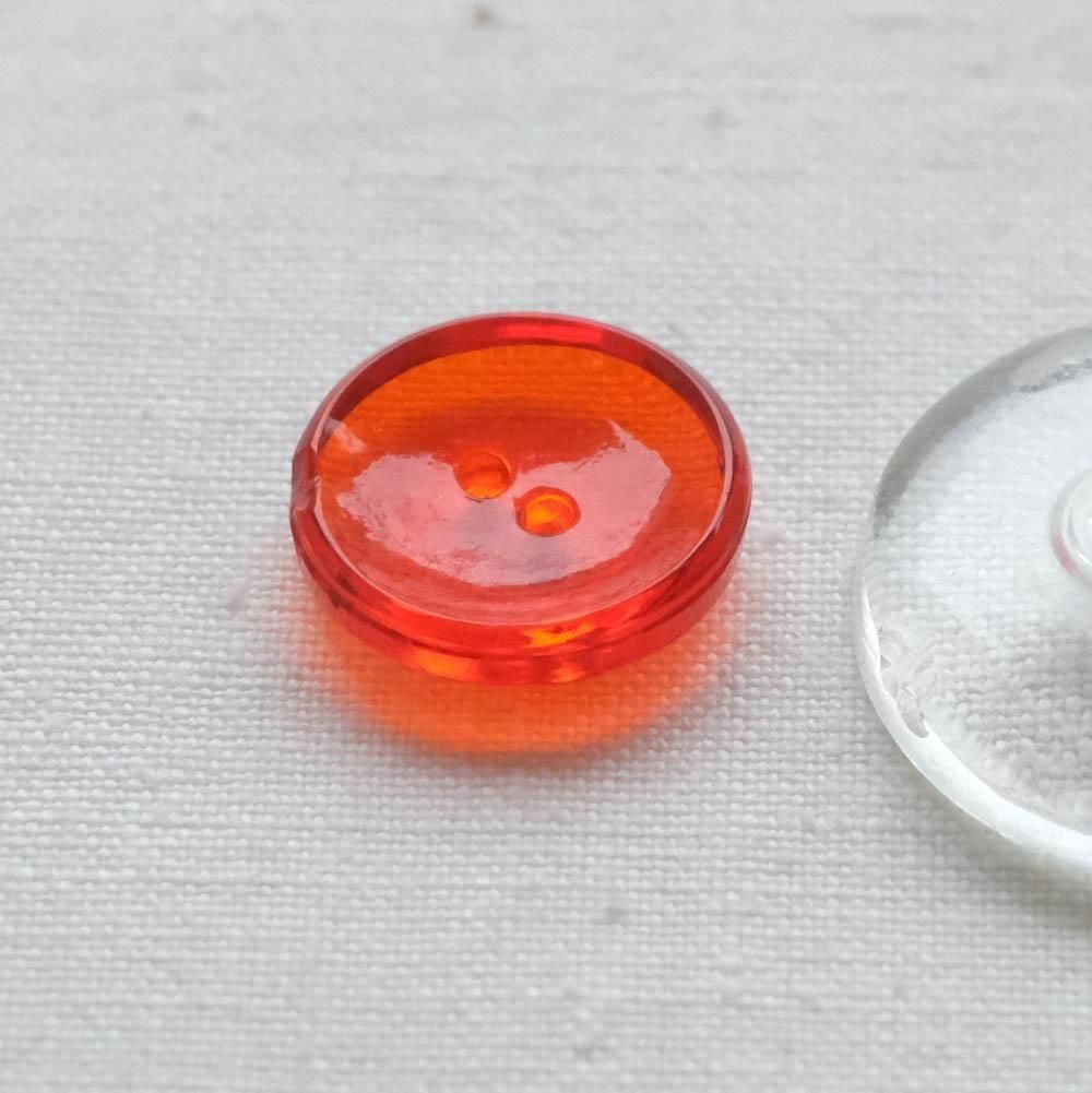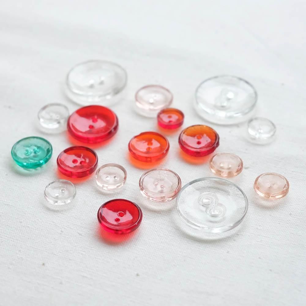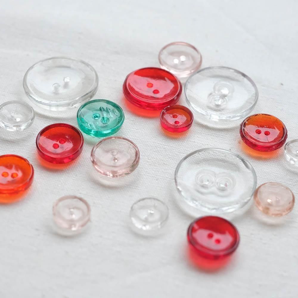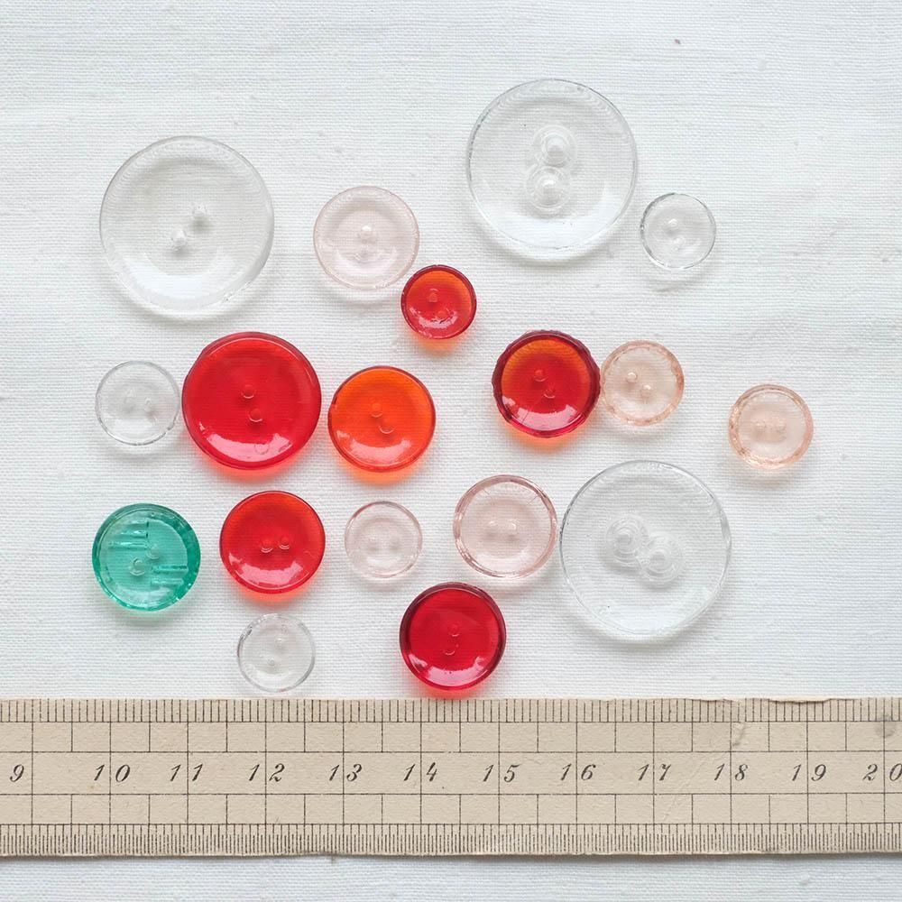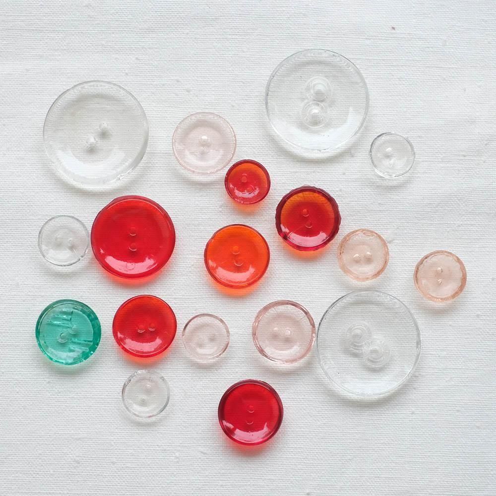 シンプルな2つ穴のガラスボタンを集めました。水の泡のような丸い透明色のボタンが並んでいるだけでなんだか心がワクワクしますね。よーく見ると朱色っぽい赤や紫がかったピンクなど色のグラデーションもキレイです。ヴィンテージならではのガラスの色と質感をお楽しみください。