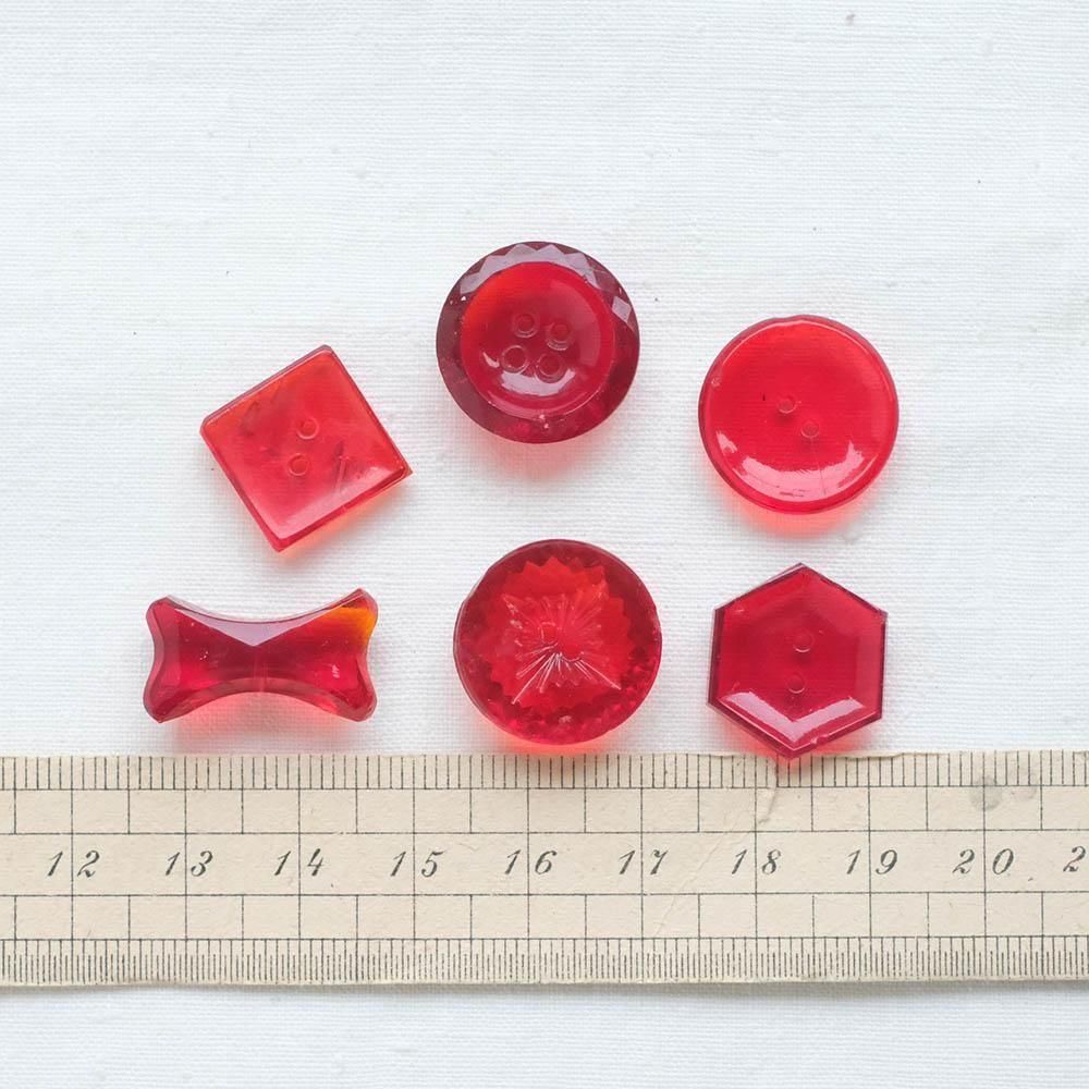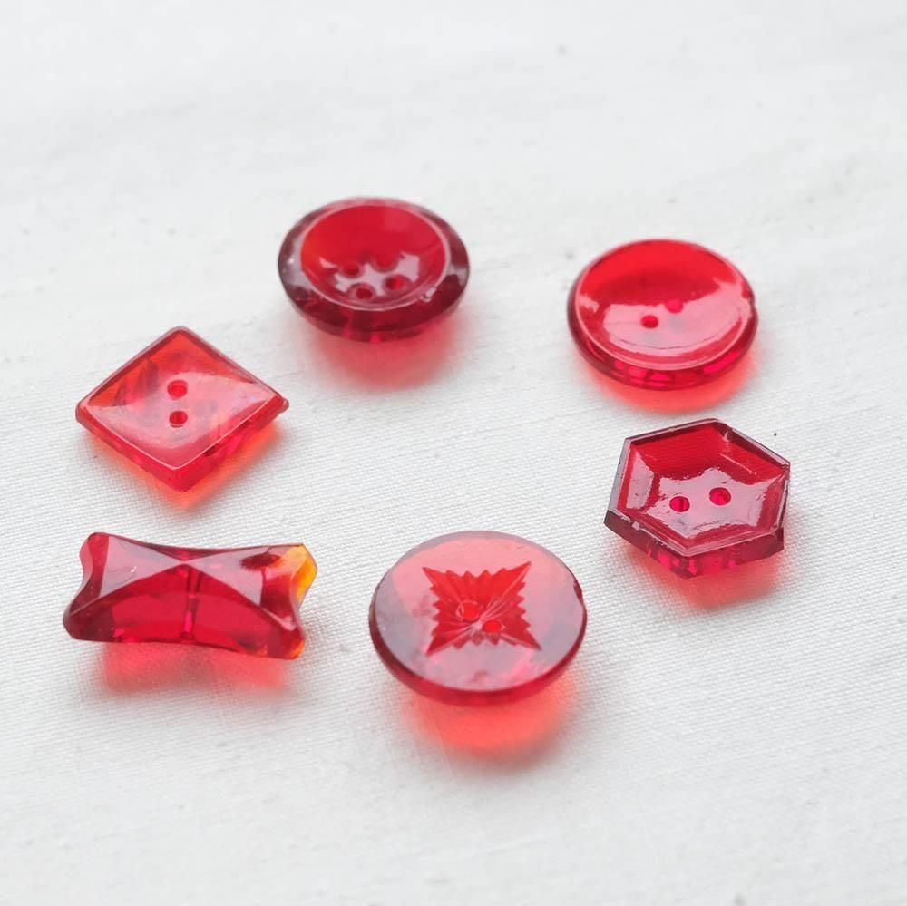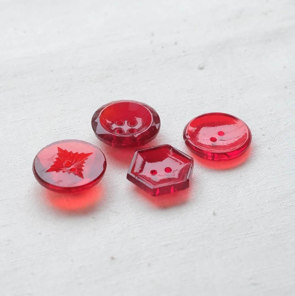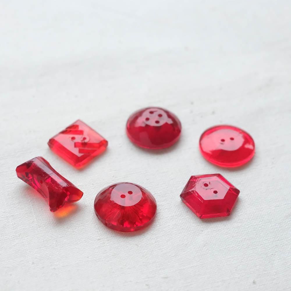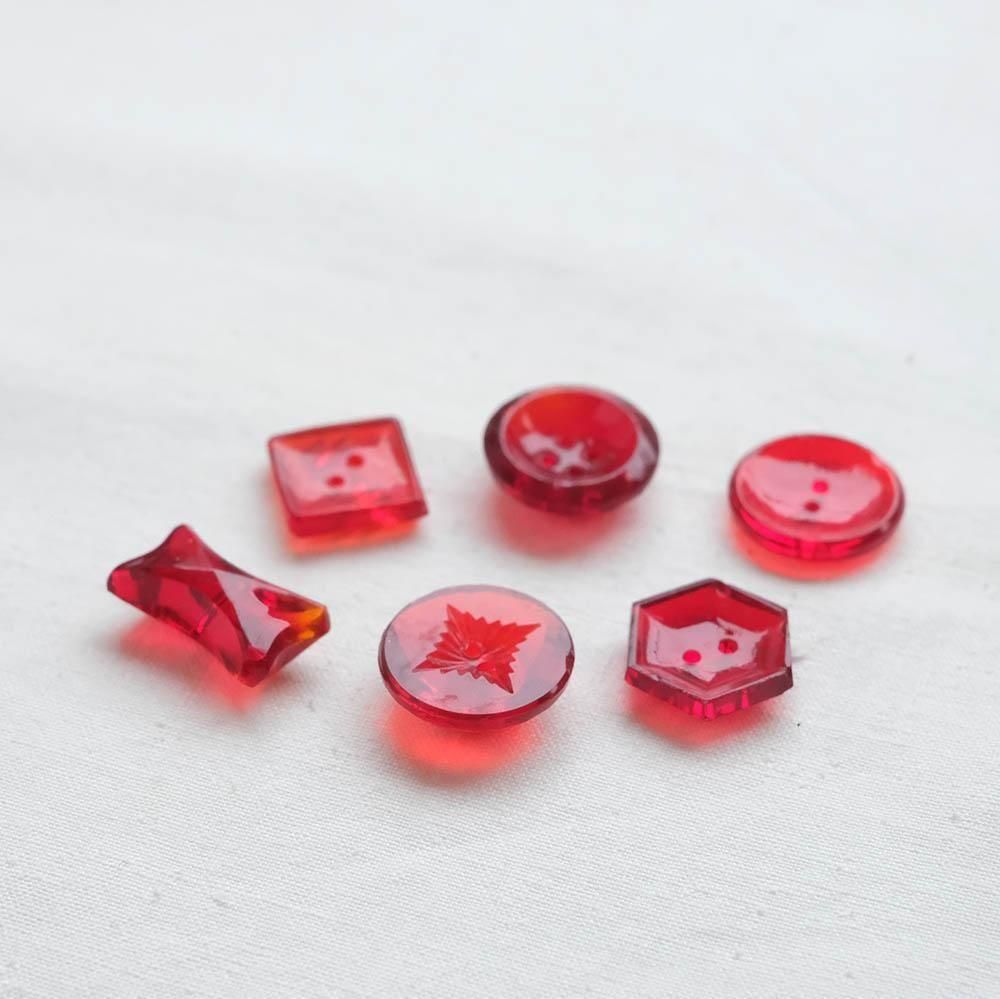 深紅色のガラスボタンを6つ集めました。分厚いガラスに細かいカットが施されたもの、丸や四角のシンプルなもの、リボンのような形のもの、全部違う形です。手作り小物のあしらいにもピッタリです。