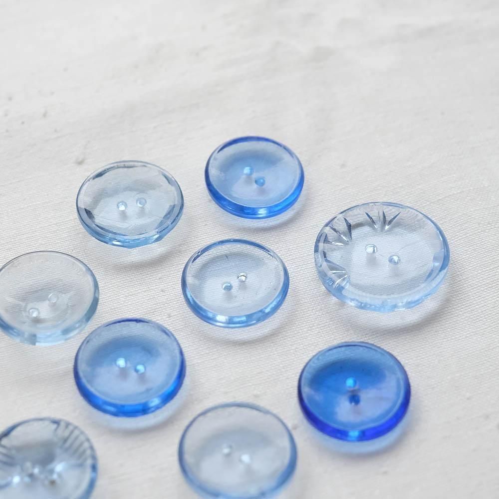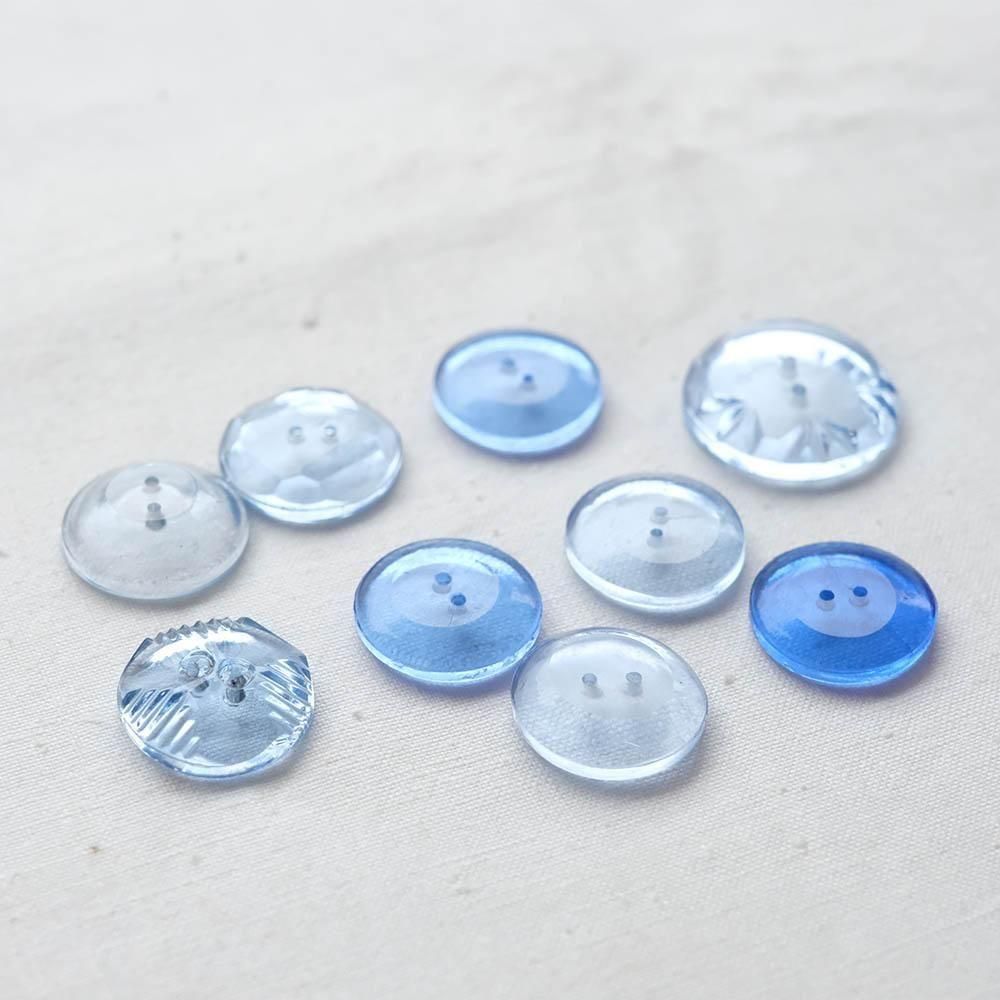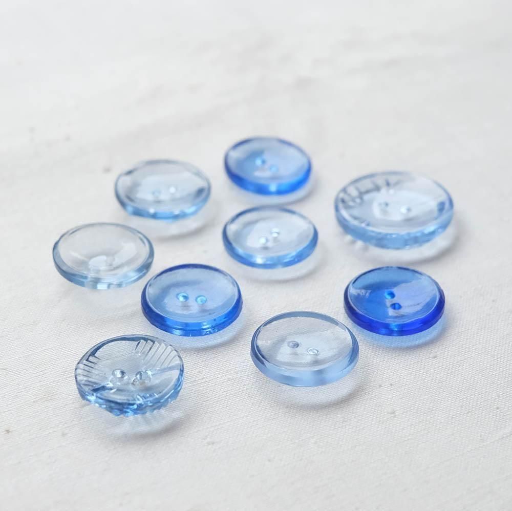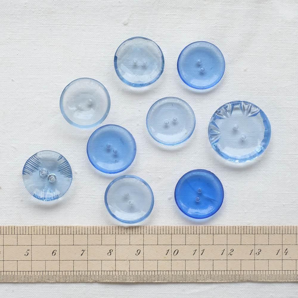 薄い青や水色のガラスボタンを9つ集めました。淡い色のグラデーション、縁や裏面にさりげなく入った模様などすっきりとした美しさがあります。