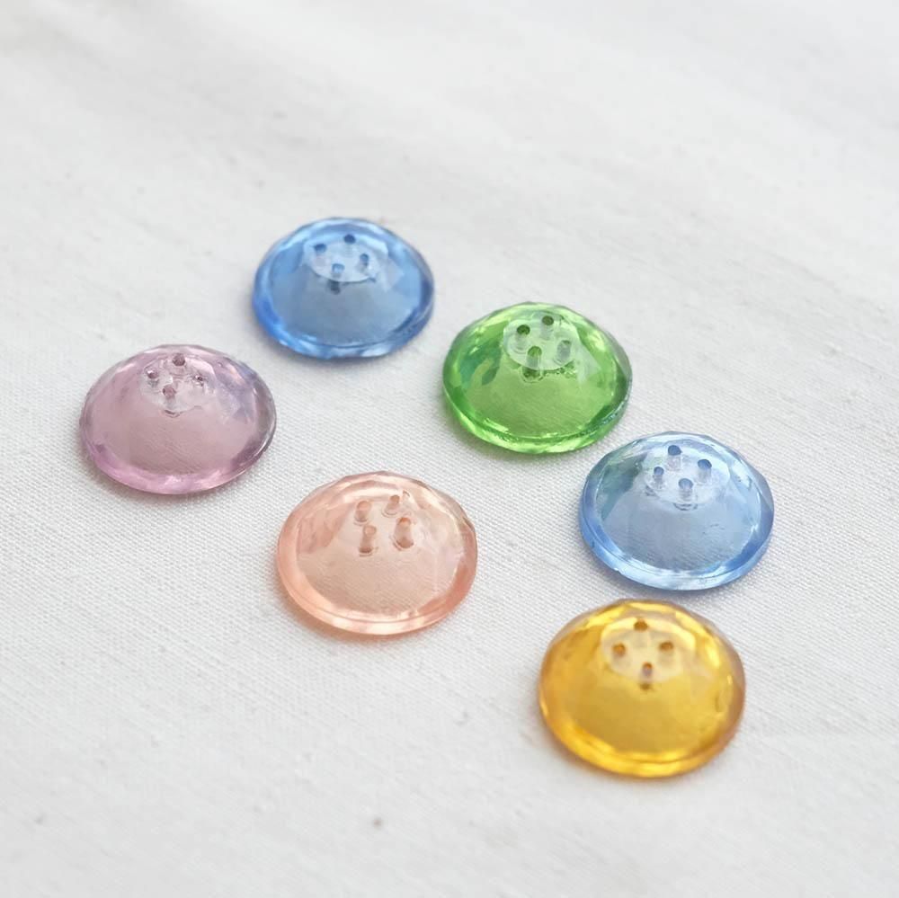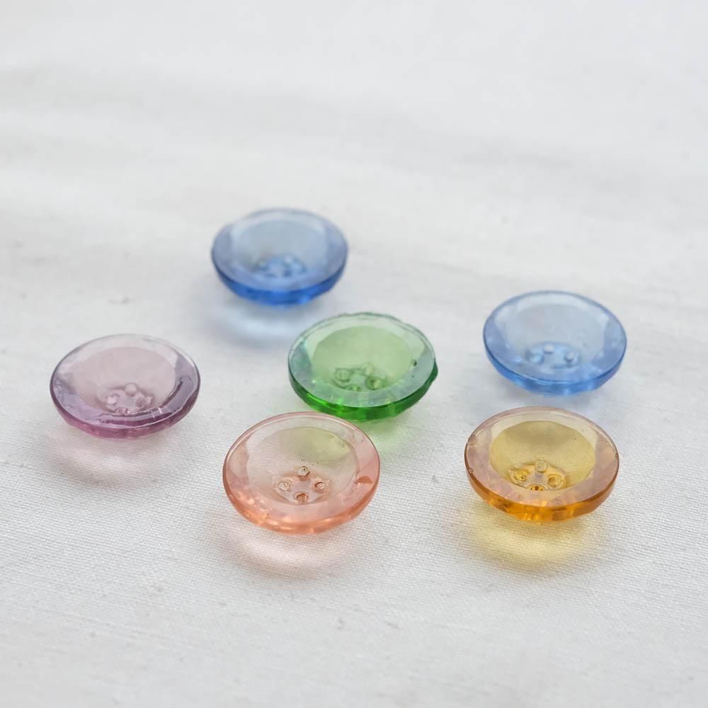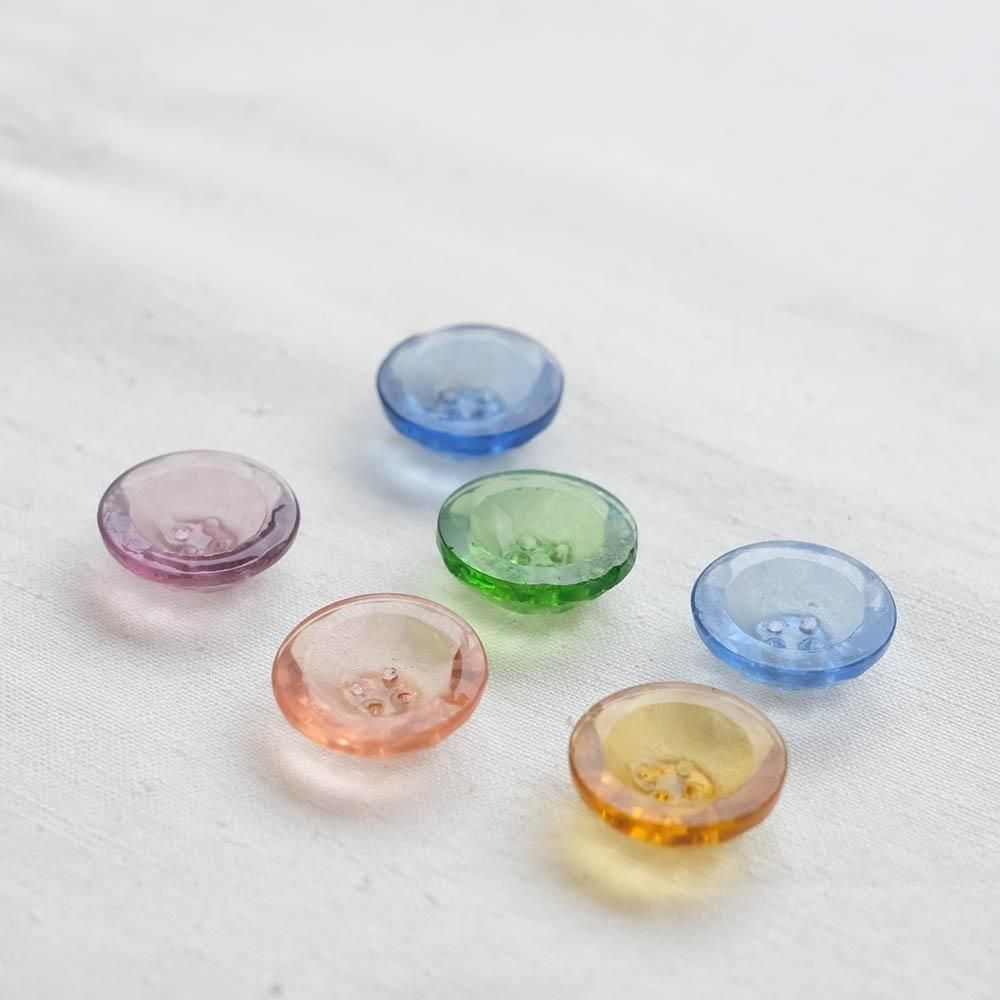 青、緑、紫などカラフルなガラスボタン6個セット。裏に入ったカットが、厚みのあるガラスを通して三角模様のように見えます。意匠のこったデザインとヴィンテージならではのまったりとした色が魅力です。