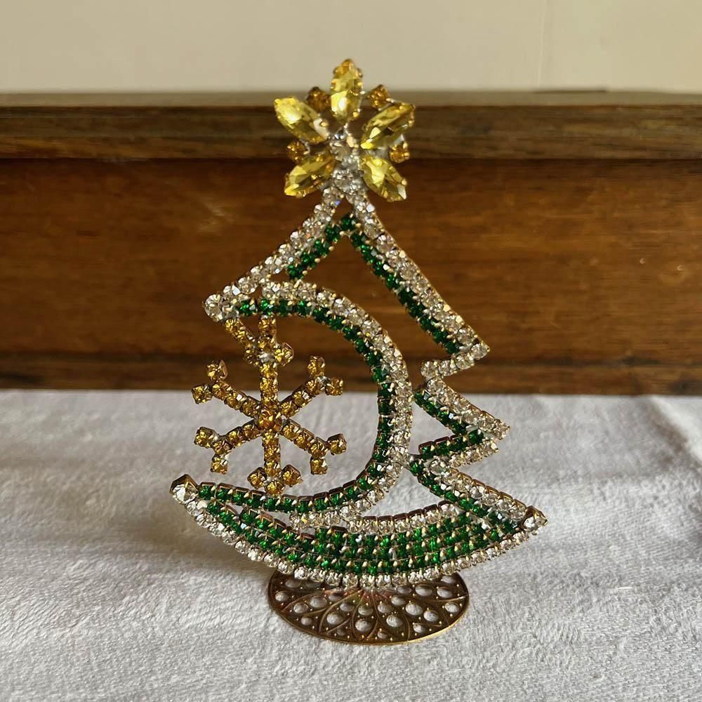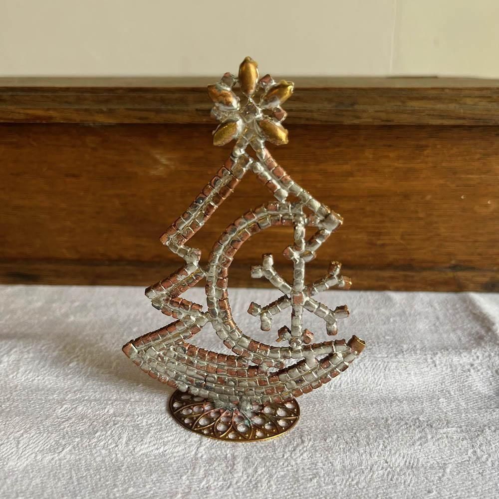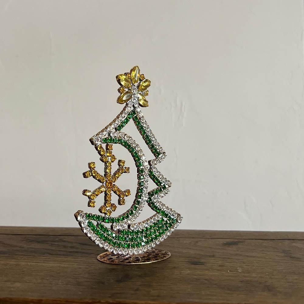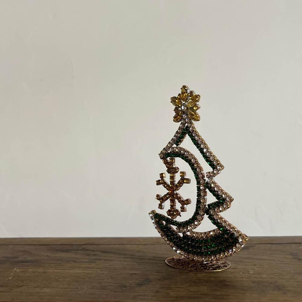 ラインストーンや金座を並べて形を作り、裏から鉛フリーの半田ごてで留めて形をつくっています。製造上どうしても形にゆがみやバラつき、傾きがあります。また、ラインストーンをカットした小さな金属片がポロリと出る場合がありますが、ツリー本体には問題ありません。手作り品の個性とご理解いただき、丁寧なお取り扱いをお願いします。